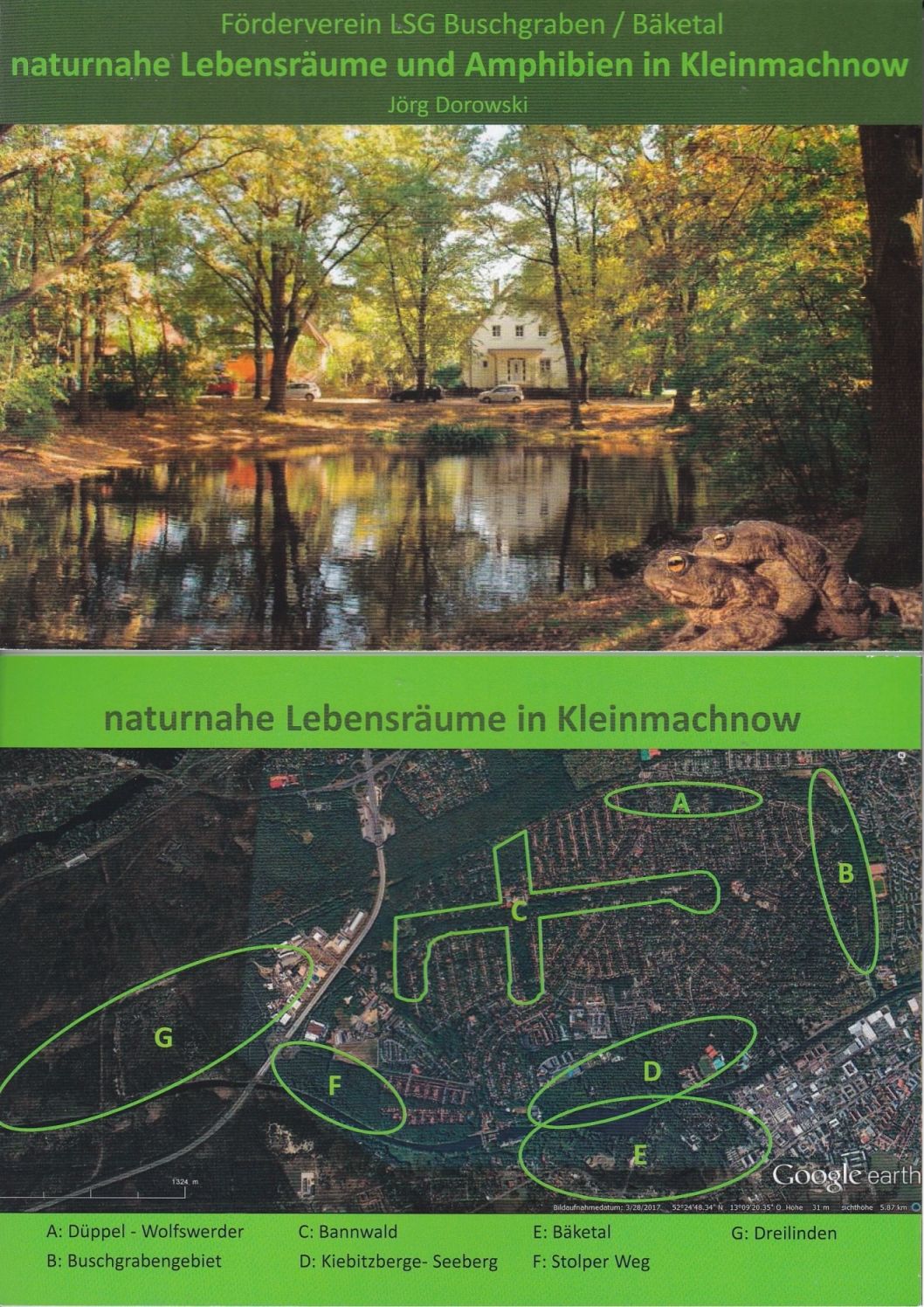 Das Heft von 2017 gibt einen Überblick über die Amphibienarten, die in Kleinmachnow nachgewiesen wurden und warum diese gefährdet sind. Dann wird auf die noch vorhandenen Naturräume und die dort vorhandenen Kleingewässer eingegangen.